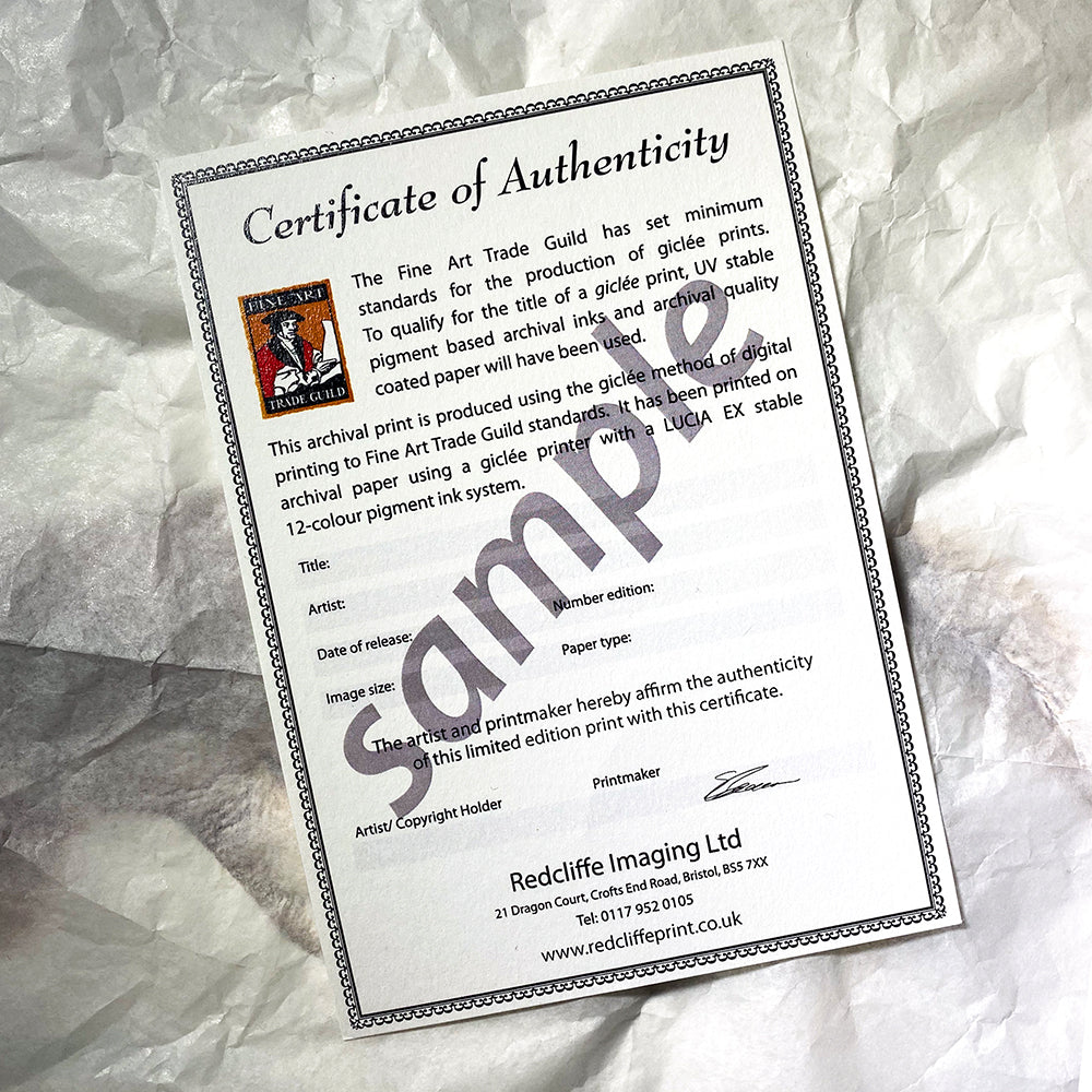 Printed at a Hahnemühle certified, Fine Art Trade Guild accredited, print studio.